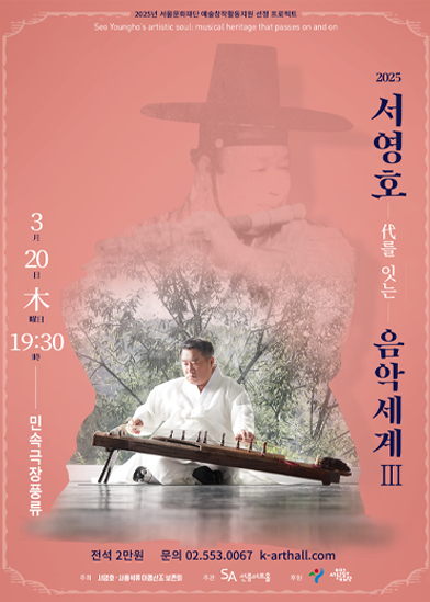 1.공연명 : 2025 서영호 대를 잇는 음악세계2.일시 : 2025년 3월 20일 목요일 오후 7시 30분 3.장소 : 국가무형유산 전수 교육관 민속극장 풍류4.티켓 : 전석 20,000원5.주최 : 서영호, 서용 석류 아쟁산조 보존회6.주관 : 선릉아트홀7.후원 : 서울시, 서울문화재단8.예매 : 온라인 판매, 당일 현장 구매 가능9. 문의  : 02 - 553 - 0067   @카카오톡 채널 선릉아트홀 : http://pf.kakao.com/_xdARxfC/chat 선릉아트홀77석의 자연음향 공연장 선릉아트홀입니다. #전통예술기획공연 #국악아카데미 #대관pf.kakao.com   @전자 우편 : sa@k-arthall.com@링크트리 : http://linktr.ee/seolleung_art Seo..
