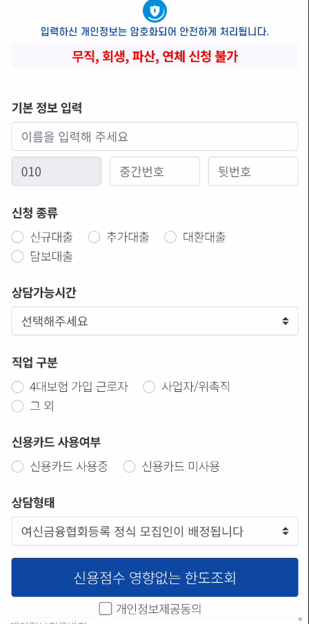 X 무직, 회생, 파산, 연체중 신청불가