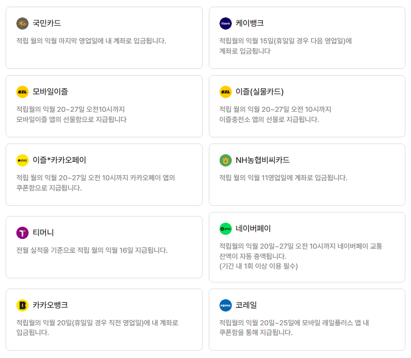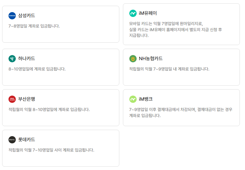 적립월의 익월 7영업일에 카드사로 지급 요청됩니다.