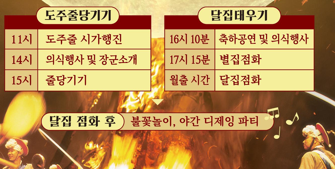 올해 정월대보름 행사는 전국 최대 규모의 달집태우기 행사와 도주줄당기기로 구성돼 오랜 전통을 계승·발전시키고 군민 화합과 풍년 농사를 기원하고자 마련됐다.
